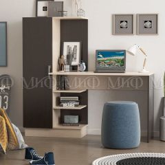 Компактный компьютерный стол «СТК 1» со столешницей размером 822*493 мм. С одной стороны столешница опирается на открытый стеллаж размером 150*734*460 мм с двумя полками. С другой стороны столешница пристыковывается к открытому пеналу размером 328*1026*296 мм также с двумя полками.