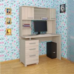 Уникальный компьютерный стол с встроенной тумбой и надстройкой, оснащенной функциональными ящиками.